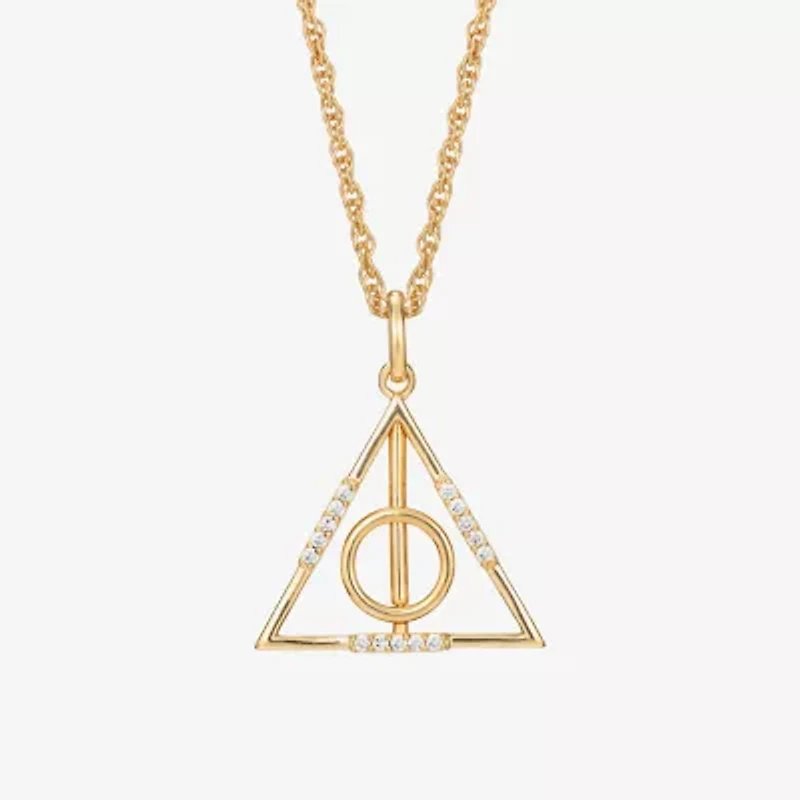 Iconic and refined, this Deathly Hallows™ symbol pendant brings a legendary emblem to a polished diamond pendant necklace. Crafted in sterling silver and plated with 14K yellow gold, the iconic symbol is accented with 1/10 CTTW diamonds that highlight the clean geometric lines representing the invisibility cloak, while the spinning Elder Wand and Resurection Stone add for a playful twist. Balanced in proportion and polished to enhance detail, this symbol pendant necklace offers a distinctive way to wear a recognizable emblem in a refined metal setting.
