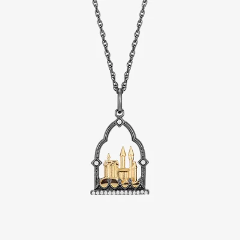 This Hogwarts™ pendant frames a brilliant silhouette of the Wizarding School. Plated in 14K yellow gold and black rhodium, 1/15 CTTW diamonds contrast against the dark frame of this whimsical fashion pendant. Careful metalwork creates depth and dimension within the structure, highlighting the grandeur and historic character of the iconic castle in a polished, collectible design.