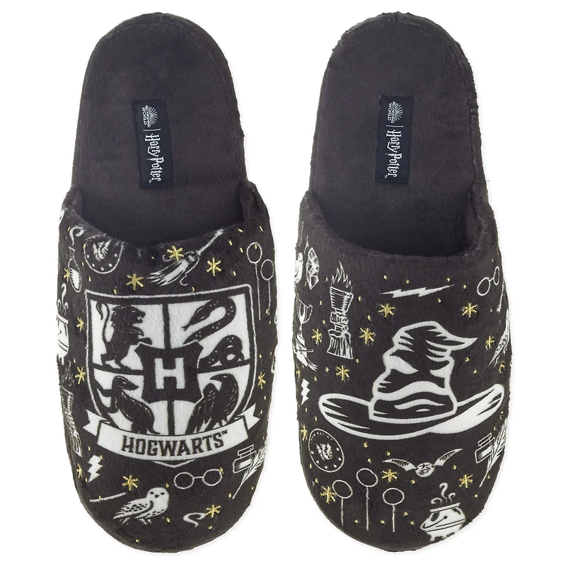 Charm your way around your Muggle house in wizard style with these fun Harry Potter slippers. Black mule slippers feature magical icon designs in white and gold with a Hogwarts crest on one. For added fun, press the button on the side of one slipper to hear the Hogwarts Sorting Hat tell you which of the four Hogwarts houses you belong in. The comfy, plush-lined footwear makes a fashionable gift for Harry Potter fans.