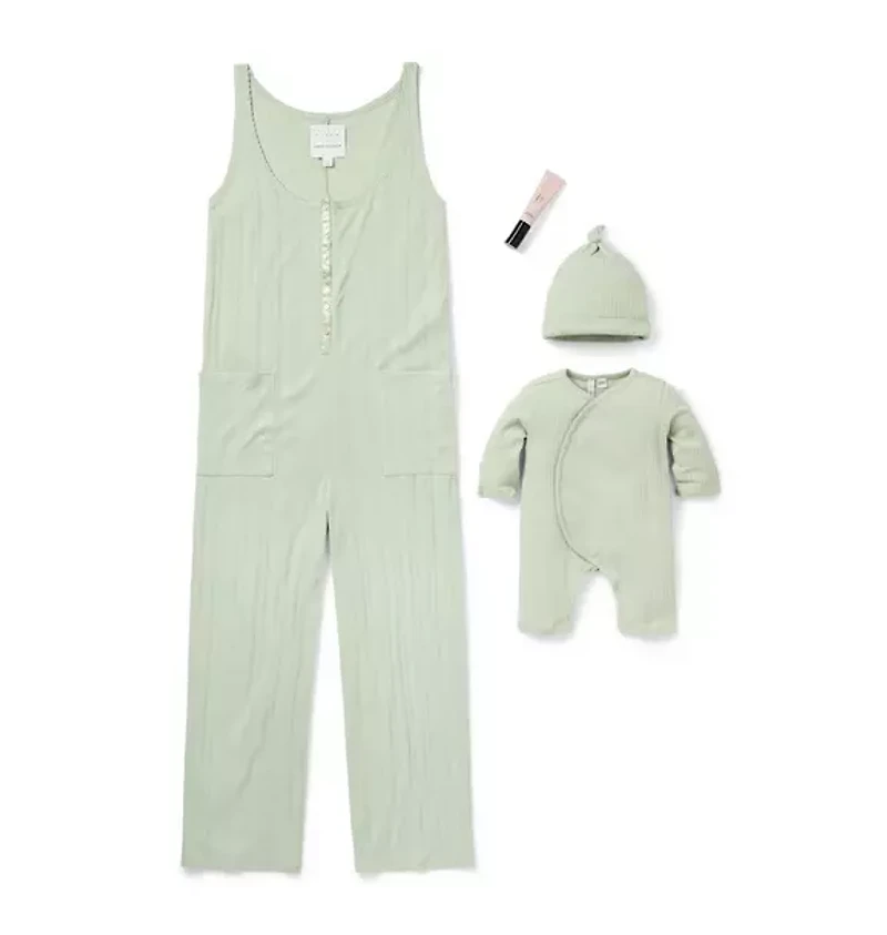 It's the best of both HATCH and Janie and Jack. Featuring a bundle of favorites that's made to match—from HATCH's beloved All-Tri Jumpsuit to the matching pointelle one-piece for baby. Includes a matching hat and a Nipple + Lip balm for mom. Machine Wash, Inside Out, Gentle Cycle; Imported