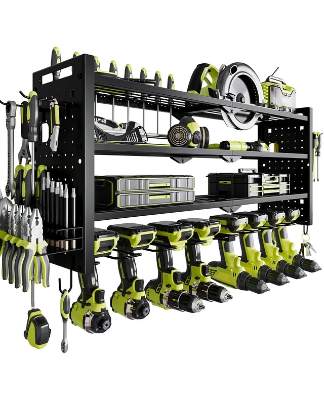 Mecale Wall-Mount Power Tool Organizer, 3-Tier Rack w/ 4 Drill Holders & Side Pegboards, Garage/Workshop Storage