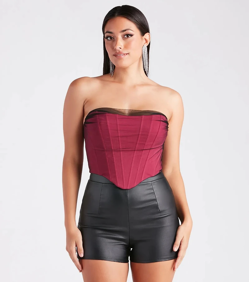 The only drama you need is this ponte corset top for elevating your fit! It features a strapless neckline, sheer tulle contrast overlay, flexible boning, and a fitted crop hem. Complete the look with currently trending bottoms.