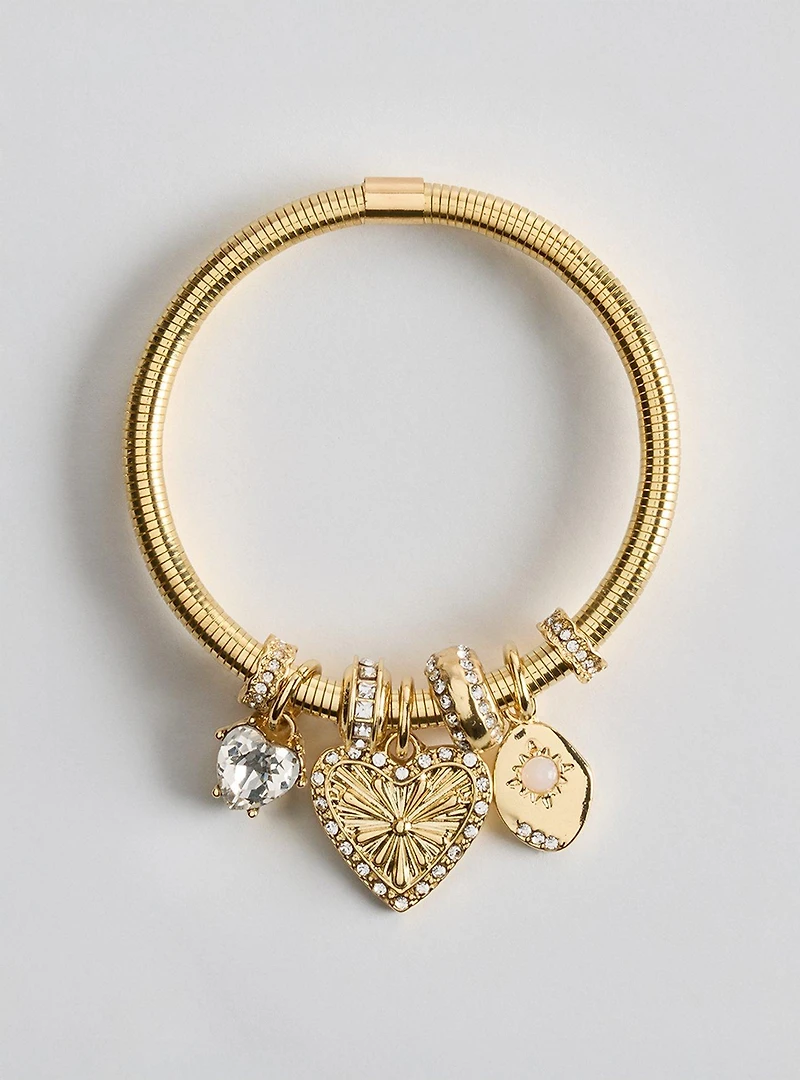 MATERIALS + CARE Man-made materials. Wipe clean with cloth. Imported. DETAILS High shine finish. Articulated stretch design. Heart charms.