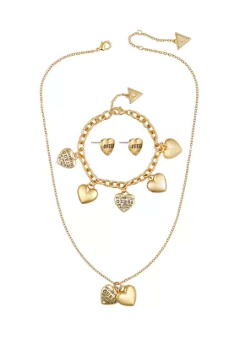 Elevate your style with this stunning GUESS boxed set, featuring a necklace with heart pendants, a charming bracelet adorned with matching heart charms, and complementary stud earrings. This versatile trio is perfect for adding a touch of classic elegance to any outfit or makes an unforgettable gift for someone special. Embellished with iconic GUESS branding, it's a timeless addition to any jewelry collection. 3-piece set Earrings: post back earring Necklace: lobster closure Polished finish Imported Material & Care Metal Clean with a soft cloth