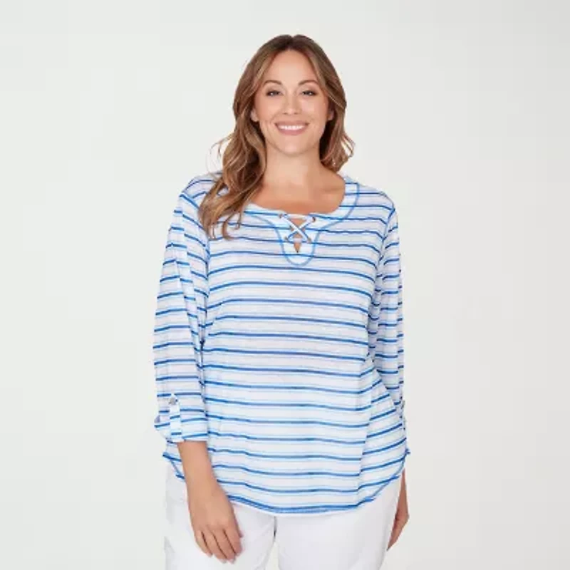 Hearts Of Palm Stripe Lacing Detail Womens Plus Split Crew Neck 3/4 Sleeve T-Shirt