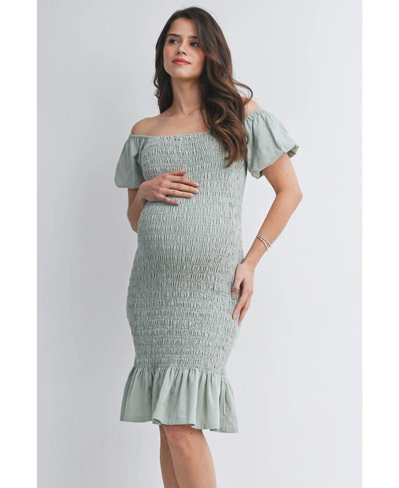 Feel confident, comfortable, and beautifully you in this must-have maternity dress designed to grow with your bump. Featuring a flattering off-the-shoulder neckline and soft puff sleeves, this dress brings a romantic touch to your everyday style. The allover smocked bodice gently hugs your curves, offering flexible stretch that adapts throughout every stage of pregnancy. A breezy ruffle hem adds movement and charm, creating a silhouette that??s both feminine and easy to wear.