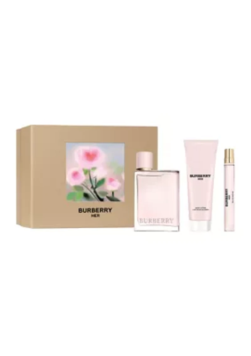 With love, offer a Burberry Her gift set inspired by British parks in spring. This Burberry Her gift set includes Burberry Her Eau de Parfum, accompanied by the matching perfumed body lotion and a travel spray ideal for both day and night. Burberry Her Eau de Parfum is the first gourmand scent with a British twist by Burberry. A burst of red and dark berry notes is lightened by a luminous white woody accord. Burberry Her Eau de Parfum is housed in a luxurious yet understated bottle, inspired by an archival Burberry fragrance design. Its transparency reveals the pink-hued Eau de Parfum, reflecting light that is playing on the relief logo of the House. Fragrance Family: Fruity Scent Type: Gourmand Key Notes: A burst of red and dark berry notes are lightened by a luminous, white woody accord. This set includes: • Burberry Her Eau de Parfum 100ml (3.3oz) • Burberry Her Body Lotion 75ml (2.4oz) • Burberry Her Eau de Parfum Travel Spray 10ml (0.33oz) Imported