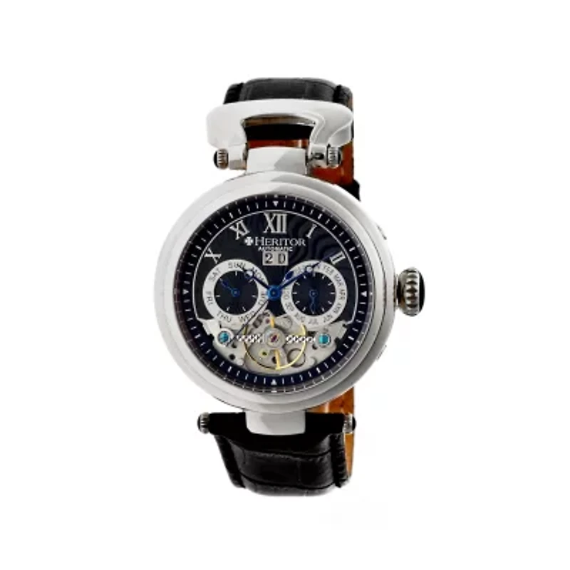 Heritor Automatic Ganzi Mens Leather Day&Date-Silver/Black Watches