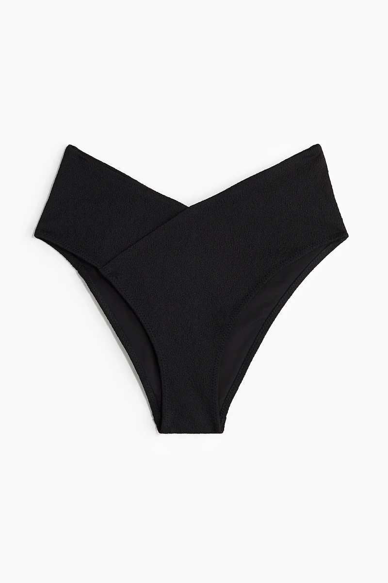 Fully lined bikini bottoms. High, V-cut waist, diagonal seam at front and back, and cutaway coverage at back.