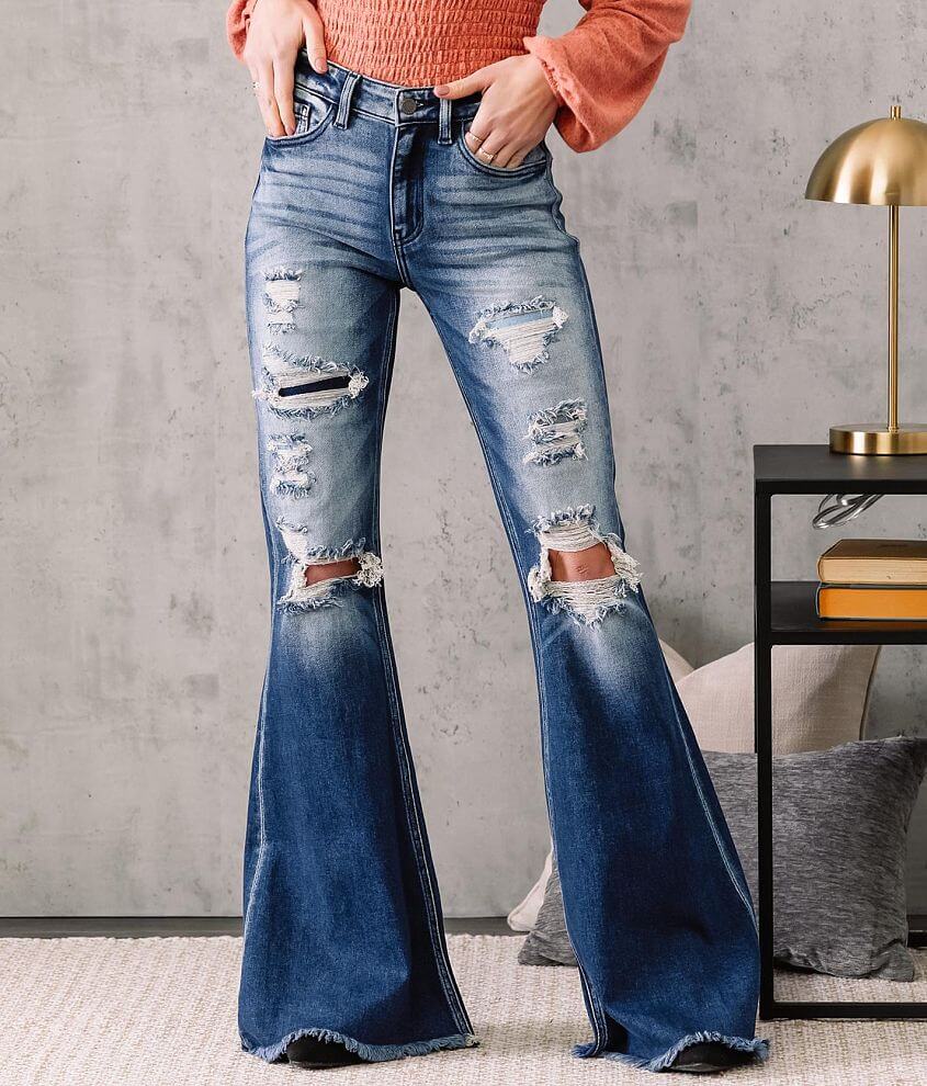 High Rise Super Flare - A high rise that sits at or above the natural waistline. Featuring a wider (flare) leg opening. High rise Stretch fabric Slightly fitted through the hip and thigh 27" super flared bottom opening Destruction, denim backing and frayed hem details Matching Mom & Me jean Shoe sku 954652 Model Info: Height: 5'6 1/2" | Bust: 32 1/2" | Waist: 24" | Hip: 34" | Wearing Size: 25x36