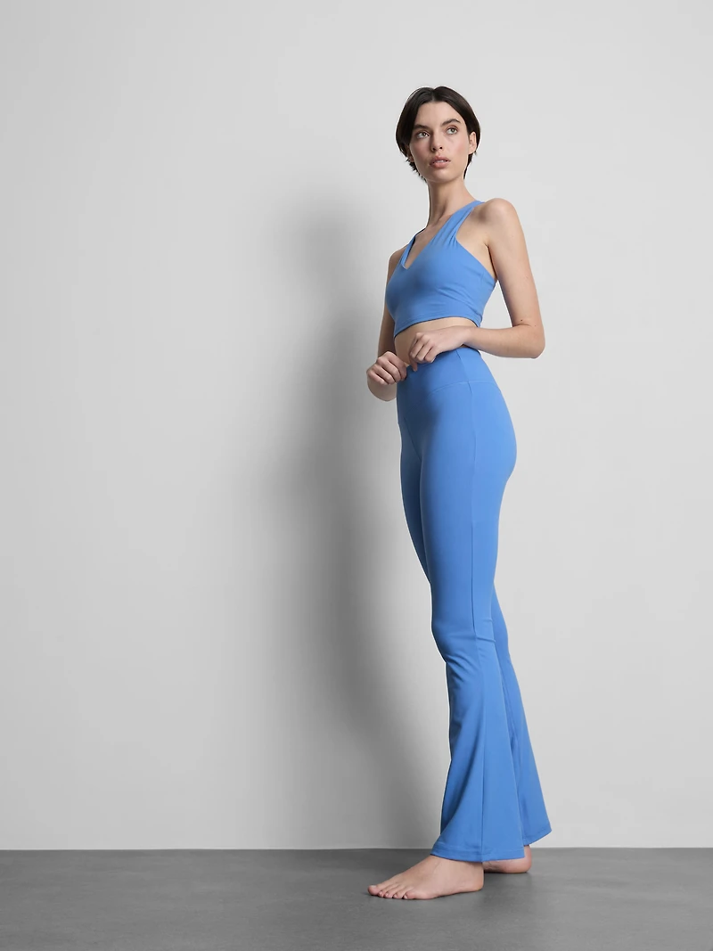 High-waisted flared leggings with a wide waistband and a sleek seamless front