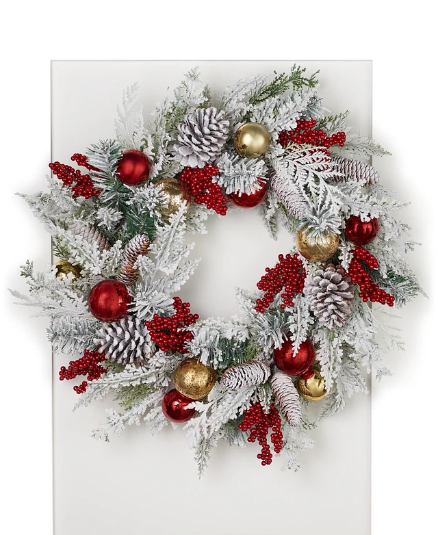 Holiday Lane Flocked Wreath with Red and Gold Ornaments, Created for Macy's