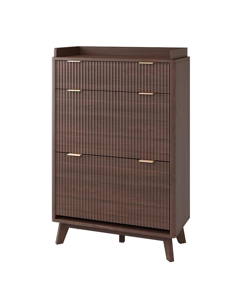 Bring a cleaner look to your entryway with this 48 in tall fluted shoe cabinet, made to store more without taking over the room, Two flip drawers keep everyday shoes tucked out of sight, while adjustable shelves help fit flats, sneakers, heels, and taller pairs with less crowding, The guardrail top gives keys, mail, and small decor a safe place to land, and the open bottom shelf keeps slippers or grab and go pairs close by, With a slim 15.75 in depth, raised legs, and a softly curved profile, it adds smart storage and warm modern style to hallways, living rooms, and apartment entries