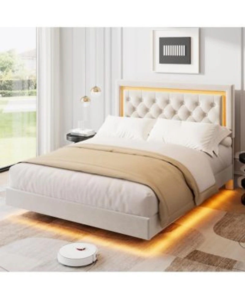 Homfan Floating Upholstered Bed Frame With Led Diamond Headboard Wood Slats Available In Full Queen King