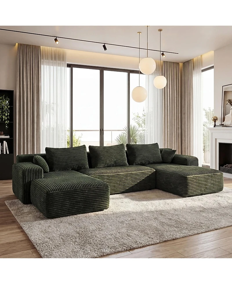 This is a modern modular U-shaped combination sofa made of luxurious corduroy fabric. The sofa is composed of multiple independent modules that can be flexibly configured according to space requirements, integrating comfort and fashion, making it an ideal center piece for large living rooms or open spaces. Its low profile design, combined with plush cushions, creates a relaxed and comfortable modern leisure atmosphere