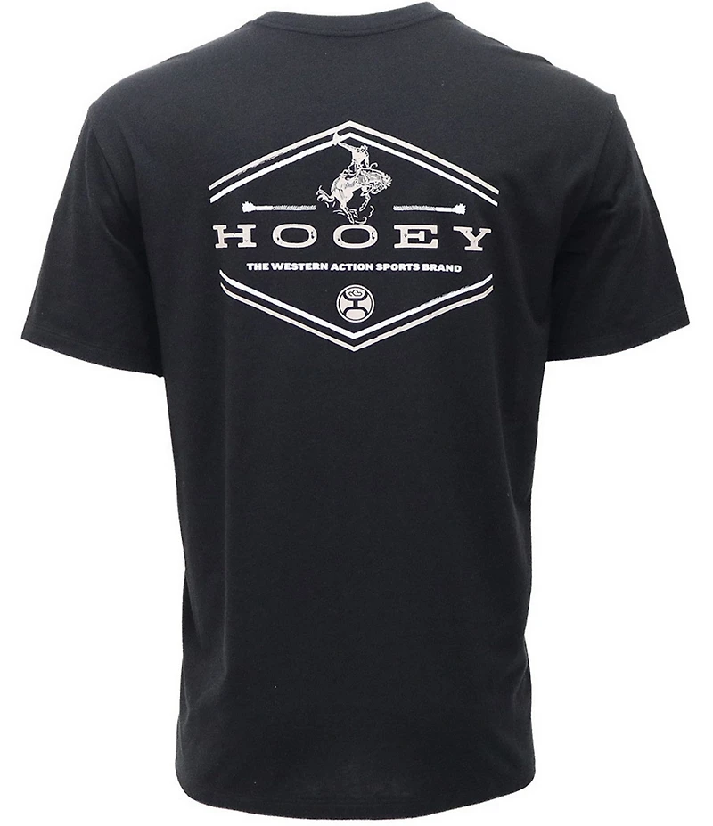 From Hooey, this t-shirt features: Crew neckline Short sleeves Rodeo cowboy and "bucking" bronco character graphic plus "Hooey" logo detail and "The Western Action Sports Brand" verbiage screenprinted on the front and back Pullover construction Cotton/polyester Machine wash/tumble dry Imported.