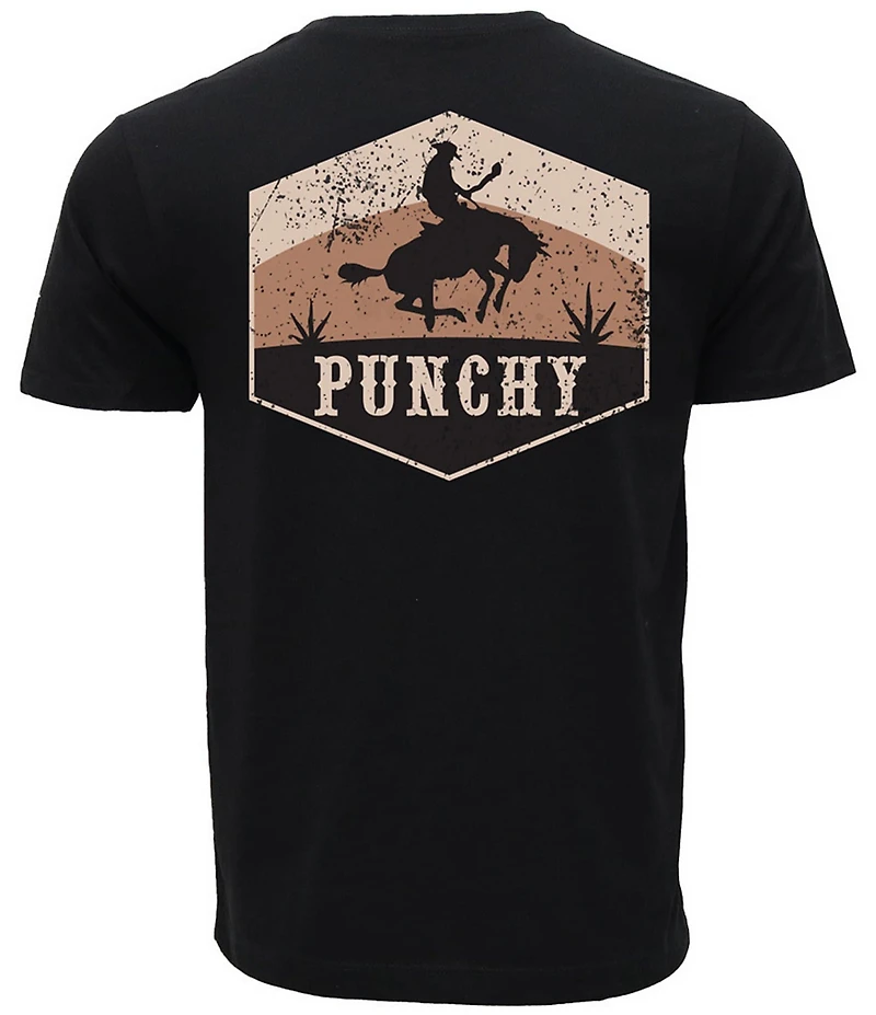 From Hooey, this t-shirt features: Crew neckline Short sleeves Rodeo cowboy "riding" a "bucking" bronco and "Punchy" verbiage on the front patch pocket Large hexagon-shaped graphic with rodeo cowboy "riding" a "bucking" bronco and "Punchy" verbiage on the back Pullover construction Cotton/polyester Machine wash/tumble dry Imported.