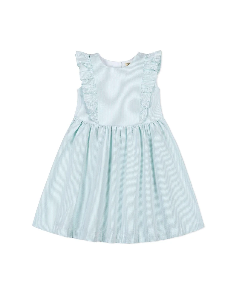 Our pretty flutter sleeve dress in soft organic cotton seersucker is a statement piece she'll want to twirl in all spring and summer long. Features flutter sleeves along a pinafore bodice, a pretty open back with button closure at the neck, and an elastic waist for easy dressing.