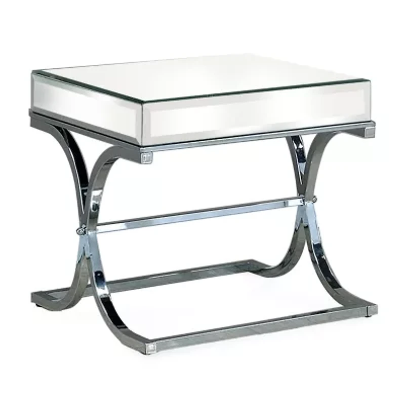 Give your home a future-forward bounce with the ultra-sleek design of this mirrored metal end table in chrome. This piece is detailed with a 5mm smoke mirror glass rectangular top that offers plenty of space for a lamp and other decorative favorites. But the highlight might be the radiance of the curved x-cross metal framework that embodies this extravagant table that's perfect for the home with modern decor.