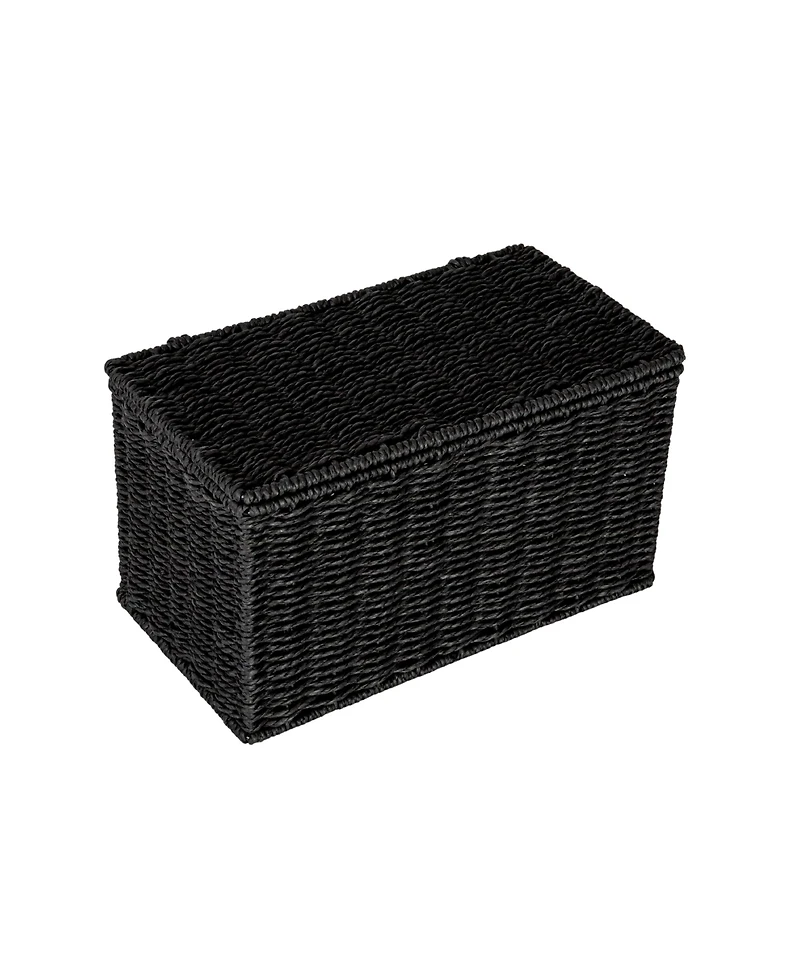 Add smart, stylish storage to any space in your home with this small woven paper rope basket with lid. This compact lidded box is made of a sturdy wire frame and a durable handwoven paper rope exterior. The lid keeps items out of sight while easily accessible. Use this small basket anywhere you need to add a little bit of extra storage, the perfect size for a shelf or desktop, vanity, or dresser, and it makes a great toilet tank topper. Use it in the bathroom to store a box of tissues, toiletries, makeup, or hair accessories. Use it in the living room to hold remotes or small controllers on a shelf, coffee table or entertainment system. Use it in the office or a craft area to keep supplies handy on a desk or work surface. No matter how you use this small storage basket, it s sure to add sophisticated practicality to any space.