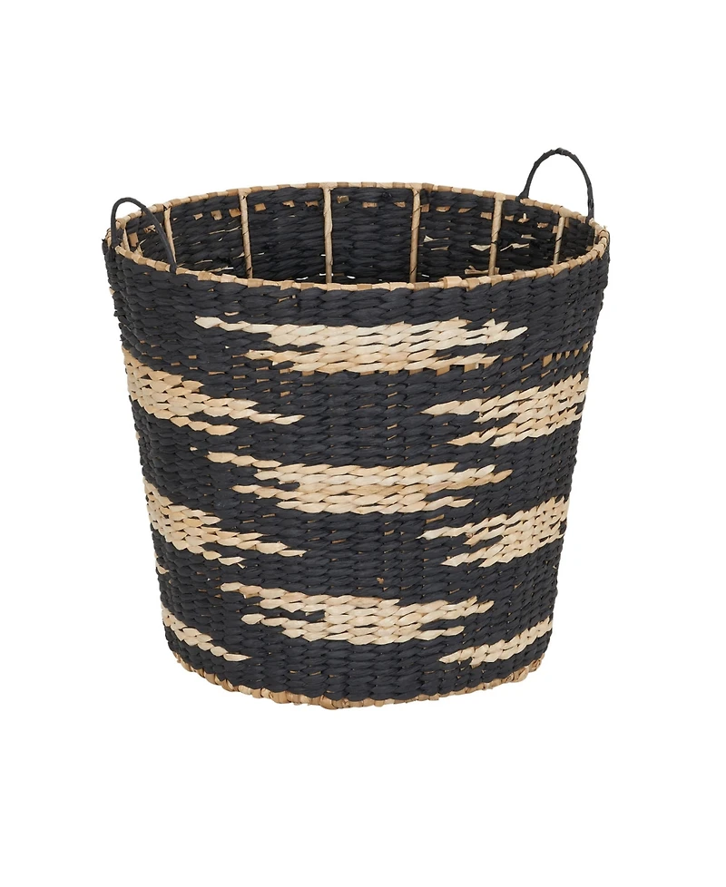 This large tapered woven basket is a stylish and practical storage solution that you can use in your home in a number of different ways. The basket has a structured wire frame with soft, durable, woven cattail and paper fibers. The basket s tapered opening makes it easy to toss items in or pull them out, and it has two handles for easy carrying. The basket is decorated with a modern design that incorporates brown and black fibers to create a chic pattern. Its neutral look is on trend, but still classic enough to fit into a variety of different decor styles and be in style for years to come.