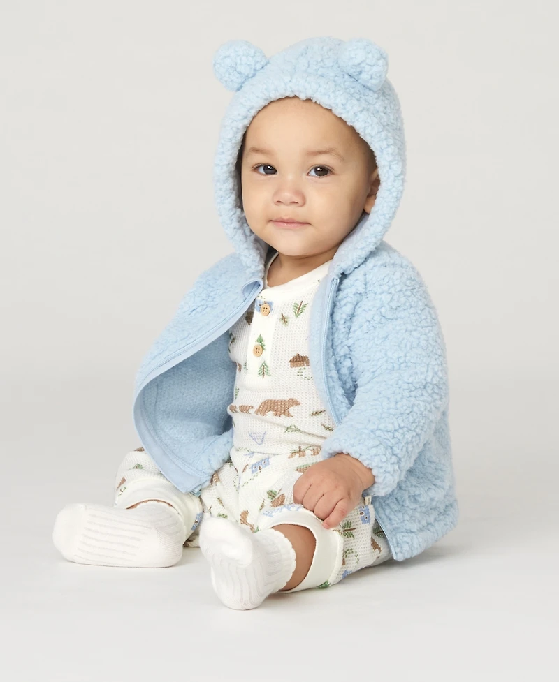Swaddle your cutie in the comfy warmth of the Huggies Baby Sherpa Jacket, Bodysuit, and Pants Set. Boasting a plush sherpa jacket with full-length zipper, hand pockets, and a playful hood with ears. The long-sleeve bodysuit showcases a fun print, paired up with the gentle ease of elastic waistband pants - absolute joy in comfort and style