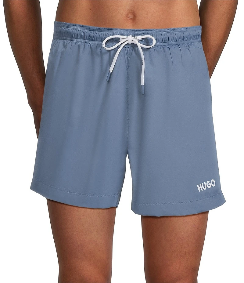 From Hugo Boss, these swim trunks feature: Drawstring elastic waistband Pull-on construction Outside logo cords “HUGO” logo print on one leg Back patch pocket 4” inseam Lightweight Quick Dry Polyamide Machine wash/line dry Imported.