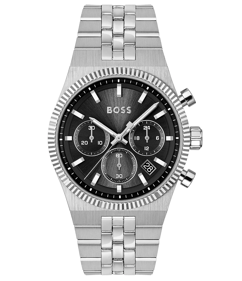 From Hugo Boss, this men's watch features: Stainless steel bracelet and case Multi layer dial Push button deployment closure Quartz chronograph movement Case size approx. 41mm Case thickness approx. 10.4mm Water resistance: 5 ATM Imported.
