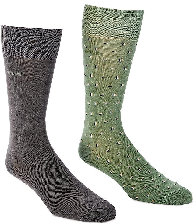 From Hugo Boss, these socks feature: (2) pairs of dress socks Mini iconic design Regular fit Crew silhouette Length: 30 cm Cotton from regenerative agriculture Cotton/polyamide/elastane Machine wash/tumble dry Imported.