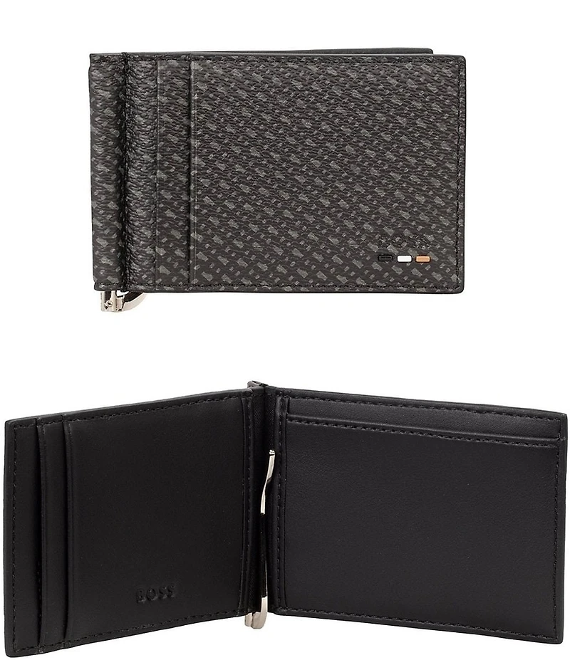 From Hugo Boss, this wallet features: 3 x card slots Money clip Boss logo embossed with tri-color metal plates Flap closure Approx. 0.4" width, 3.9" length, 2.7" height Polyester polyurethane; lining: polyester Spot clean Imported.