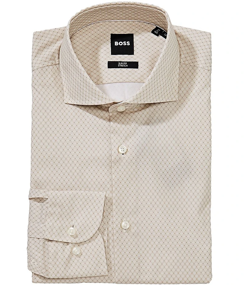 From Hugo Boss, this dress shirt features: Slim fit Allover geometrical pattern Spread collar Long sleeves with button round cuffs Button-front closure Rounded hem Cotton/elastane Machine wash warm/line dry Imported.