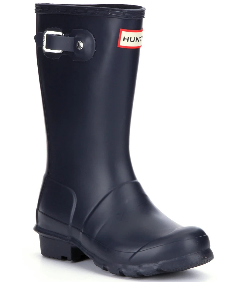 From Hunter, the Kids' Original Matte Waterproof Buckle Strap Rain Boots feature: vulcanized rubber upper handcrafted design made from 28 parts graded leg heights for growing kids lacquer finish pull-on construction textile lining rubber outsole approx. 11" shaft height Imported. BLOOMING: Occasionally, you may notice a white powdery "bloom" on your Hunter rubber wellington boots. This is because rubber is a natural product and in certain conditions, insoluble particles may rise to the surface. This is a common process, characteristic of high quality, natural rubber and nothing to worry about. It will not affect the performance or durability of your boots. A pristine finish and shine can be easily restored with regular use of Hunter Boot Buffer or Instant Boot Shine.