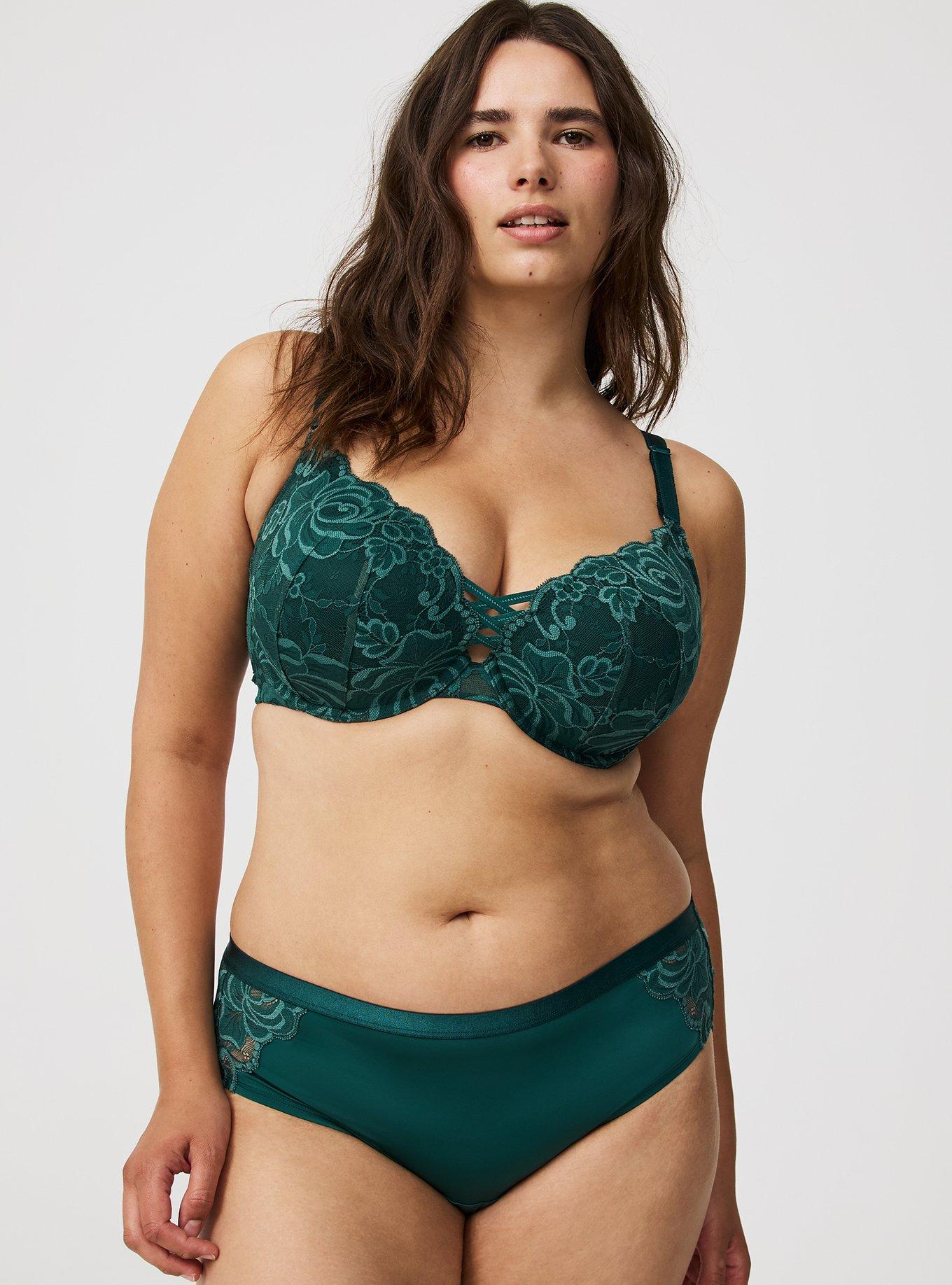 FIT Mid rise. Hipster silhouette. Minimal coverage. MATERIALS + CARE Microfiber & Hurricane Lace knit fabric. 79% nylon, 21% spandex. Machine wash cold. Dry flat. Imported. DETAILS Elastic waistband.