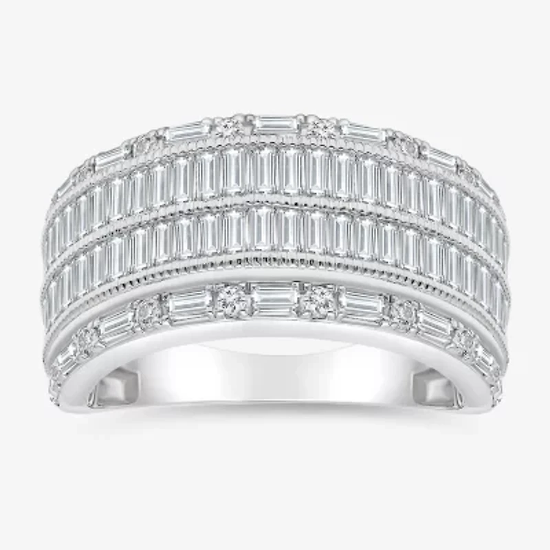 Mark your love in ultra-glamorous style with this women's 10K White Gold anniversary band from the Modern Bride collection. This 4 layer ring features an intricate construction with baguette and round cut Lab-Grown Diamonds equaling 2 sparkling carats in total.