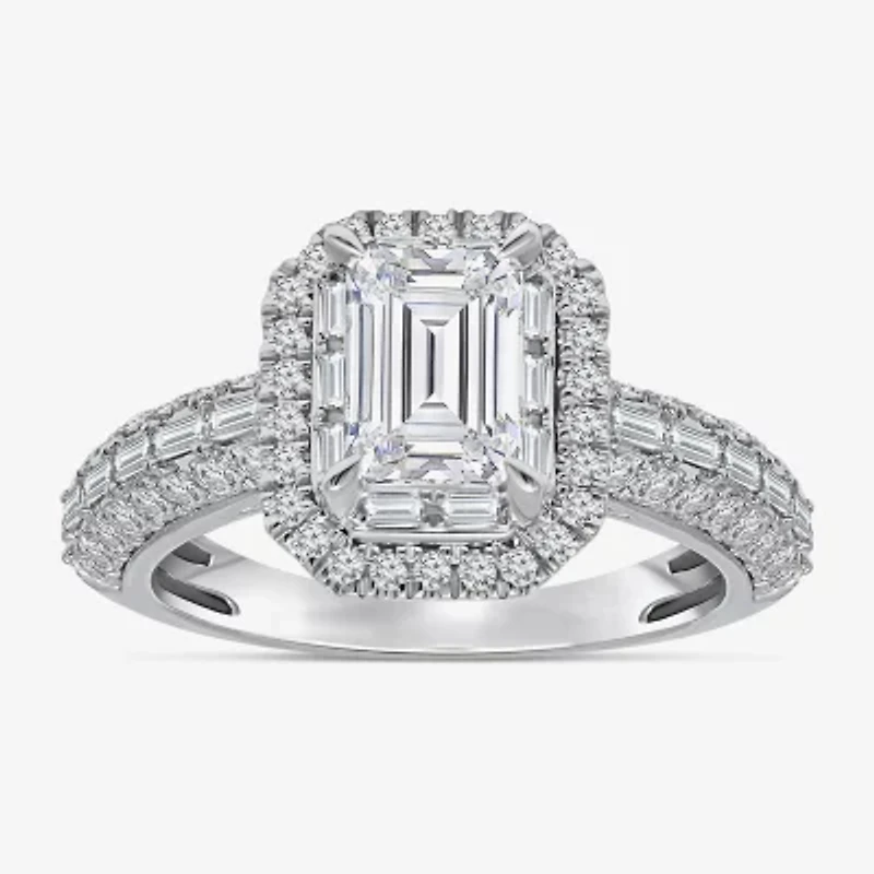 Saying yes is easy with this stunning women's 10K White Gold engagement from the Modern Bride collection designed with a 1 carat emerald-cut Lab-Grown Diamond center surrounded by a double halo of baguette and round-cut stones for added sparkle. The band is adorned with additional baguette and round-cut Lab-Grown Diamonds for a 2 carat total weight.