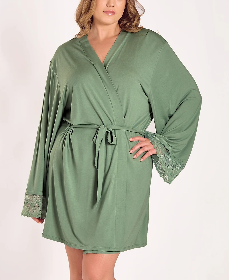 Instantly elevate your sleepwear collection in our sage modal jersey robe with its intricate lace detailing that makes it truly divine. Designed with a fluid drape and weight as a year-round go-to. She has looped self-tie sash, inner ties soft and radiates with an elegant sheen. Complete the look with her matching laced modal chemise dress or camisole and short set. This robe comes in standard and plus sizes.
