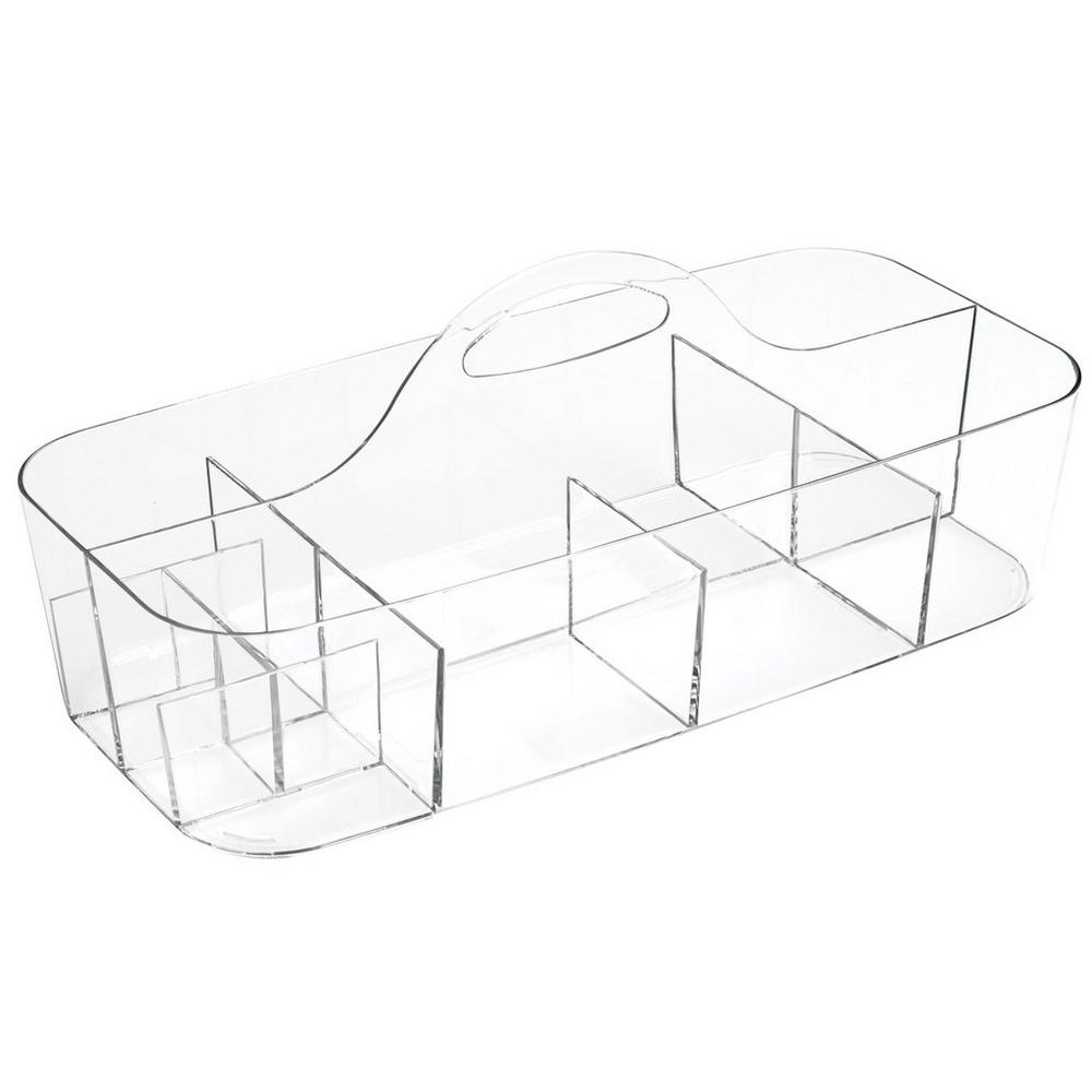 Plastic Cosmetic Organizer Tote. Features: BATH CADDY The iDesign vanity organizer tote with handles has nine compartments for storing shampoo and conditioner, razors, washcloths, and more. the portable tote is ideal for communal college dorm bathrooms, master bathrooms, and kids bathrooms. VERSATILEDESIGN Not only is the shower caddy tote great for use in the bathroom, but it also works for extra organization and storage throughout the house in the office, kitchen, laundry room, pantry, under the sink, or anywhere else for easy storage. FUNCTIONAL & PORTABLE This storage container for organizing features holes at the bottom to allow water to drain after use. the integrated handles make this bathroom caddy easy to transport wherever you need it. MADE WITH RECYCLED PLASTIC Made of durable recycled plastic for years of quality use, the bathtub caddy has an attractive clear finish that matches any home. EFFICIENT SIZE Measuring 14.5" x 7" x 5.75", the portable shower caddy basket is ideal for organizing all your bath and shower accessories. Features: VERSATILE DESIGN Not only is the shower caddy tote great for use in the bathroom, but it also works for extra organization and storage throughout the house in the office, kitchen, laundry room, pantry, under the sink, or anywhere else for easy storage. Features: FUNCTIONAL & PORTABLE This storage container for organizing features holes at the bottom to allow water to drain after use; the integrated handles make this bathroom caddy easy to transport wherever you need it.