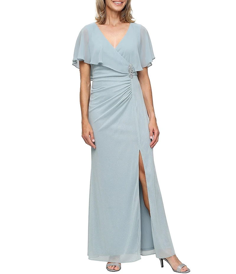 From Ignite Evenings, this dress features: Glitter mesh and chiffon fabrications Surplice neckline Short sleeve Lined Glitter Waist embellishment Ruched waist Chiffon overlay Side slit Back zipper closure Approx. 57.5" in length Polyester Hand wash cold Imported.