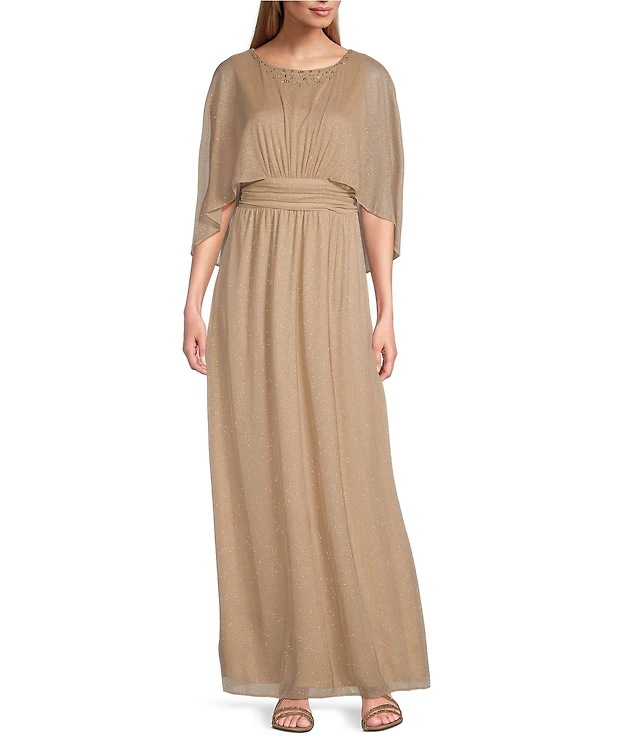 Ignite Evenings Petite Size 3/4 Sleeve Asymmetrical Glitter Mesh Capelet V-Neck Jersey Gown