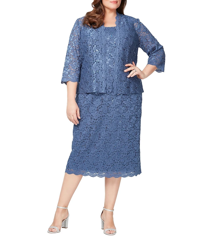 Ignite Evenings Plus Size Scalloped Sequin Lace Square Neck 3/4 Sleeve 2-Piece Jacket Dress