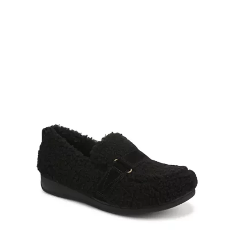Slip into the warmth of the Imogen closed-back slipper, crafted with soft faux shearling and a smooth microfiber lining. Designed for effortless comfort, it features a hook-and-loop strap with D-ring detail, a lightweight EVA midsole, and a grippy TPR outsole—plus a convenient pull tab for easy wear. A biomechanically designed footbed for comfort that keeps you in motion. . Built-in VIO MOTION Technology footbed featuring contoured arch support, with shock-absorbing cushioning, deep heel cup to provide stability, and forefoot flexibility. The exclusive alignment technology balances the whole you. Hook and eye closure Vietnam Imported Product Specifications 1.375 in. 0.125 M Material FABRIC, TPR, Fabric Fabric