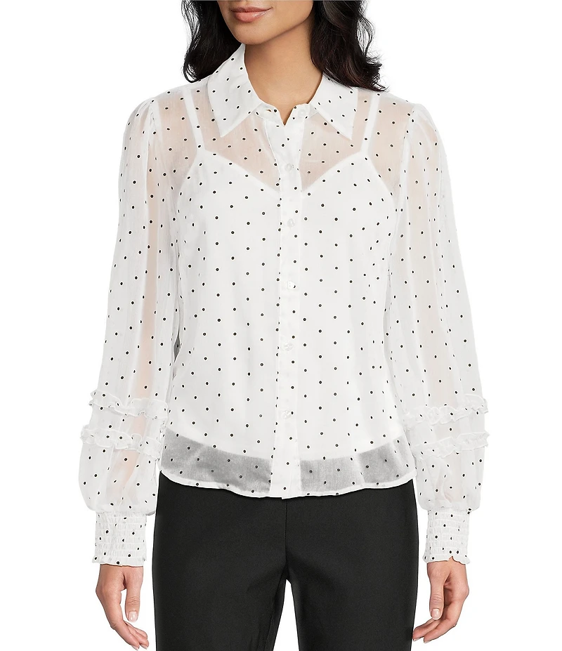 From I.N. San Francisco, this top features:  Spread collar Long puff sleeves with cuffs Ruffle sleeve detail  Button front closure Polyester Machine wash /line dry Imported.