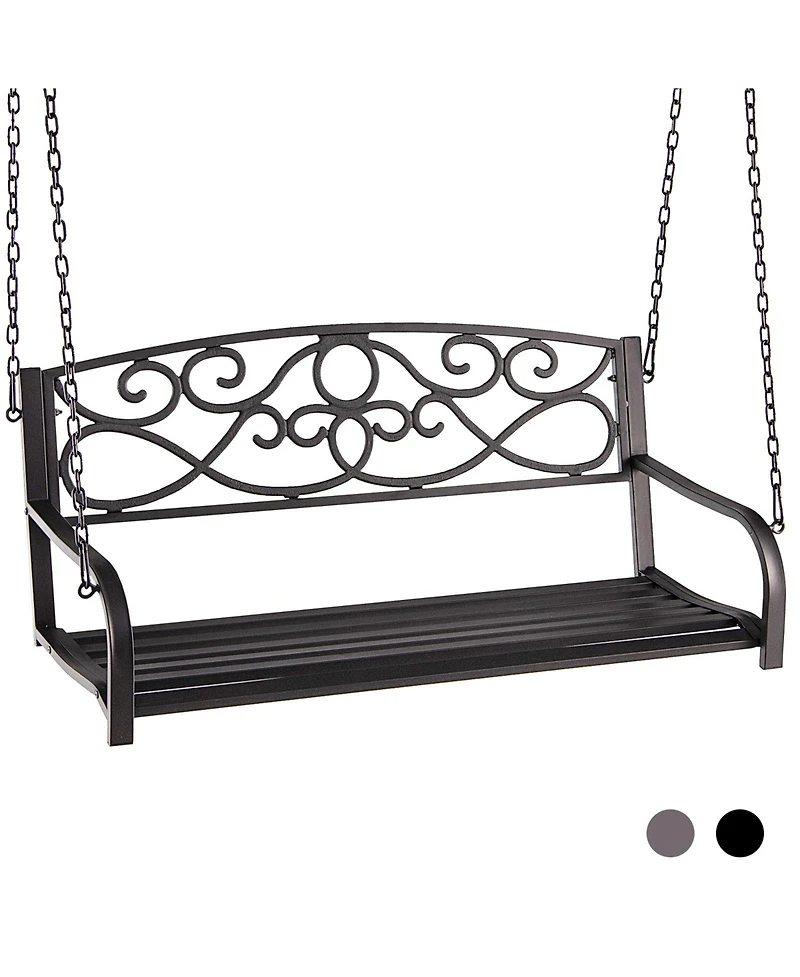 Enhance your outdoor space with our elegantly designed 2-seat porch swing. Built with high-grade metal pipes and a rust-resistant plastic coating, this swing ensures durability and weather resistance for long-lasting use. The generous 49-inch seat provides ample space for two, featuring curved armrests and a breathable backrest for maximum comfort. With its retro style and decorative backrest patterns, this swing bench adds a touch of classic charm to any setting. Equipped with extra-long 110-inch chains, it offers versatile hanging options for your porch, park, balcony, or backyard, making it perfect for relaxing with a loved one.