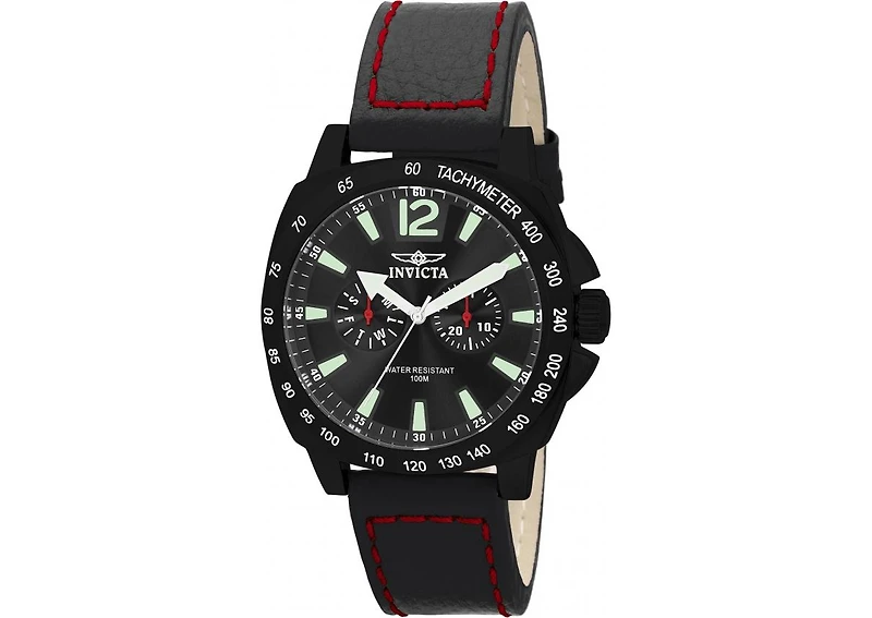 Black ion-plated stainless steel case with a black leather strap. Fixed black ion-plated bezel showing tachymeter markings. Black dial with luminous hands and stick hour markers. An Arabic numeral marks the 12 o'clock position. Minute markers around the outer rim. Dial Type: Analog. Luminescent hands and markers. Day of the week and date sub-dials. Swiss quartz movement. Scratch resistant flame fusion crystal. Pull / push crown. Solid case back. Case diameter: 44 mm. Case thickness: 13 mm. Round case shape. Band width: 22 mm. Tang clasp. Water resistant at 100 meters / 330 feet. Functions: date, day, hour, minute, second. Casual watch style. Invicta Specialty Black Dial Black Ion-plated Stainless Steel Men's Watch 0857.
