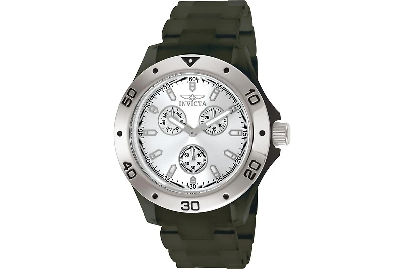 Thermo polymer plastic case with a thermo polymer plastic strap. Fixed bezel. Silver-tone dial with silver-tone hands and index hour markers. Minute markers around the outer rim. Dial Type: Analog. Luminescent hands and markers. Date, day. Day, date, 60-second. Quartz movement. Japanese tmi vd76 quartz engine. Scratch resistant flame fusion crystal. Pull / push crown. Skeleton case back. Case diameter: 46mm. Case thickness: 13mm. Round case shape. Band width: 22mm. Band length: 8.75 inches. Push button dual deployant clasp. Water resistant at 100 meters / 330 feet. Functions: date, day, hour, minute, second. Casual watch style. Invicta Anatomic Sunray Thermo Men's Watch 1668.