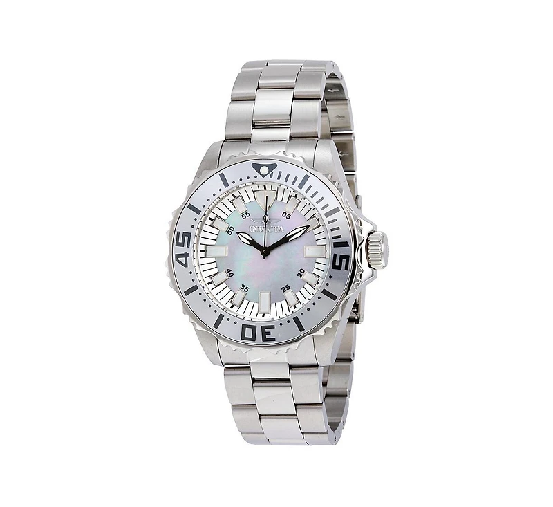 Stainless steel case with a stainless steel bracelet. Uni-directional rotating stainless steel bezel. Blue mother of pearl dial with luminous black hands and index hour markers. Minute markers around the outer rim. Dial Type: Analog. Luminescent hands and markers. Quartz movement. Scratch resistant mineral crystal. Pull / push crown. Solid case back. Case diameter: 45 nmm. Case thickness: 13 mm. Round case shape. Band width: 22 mm. Band length: 8.25 inches. Fold over with safety release clasp. Water resistant at 100 meters / 330 feet. Functions: hour, minute, second. Casual watch style. Invicta Pro Diver Mother of Pearl Dial Stainless Steel Men's Watch 17693.