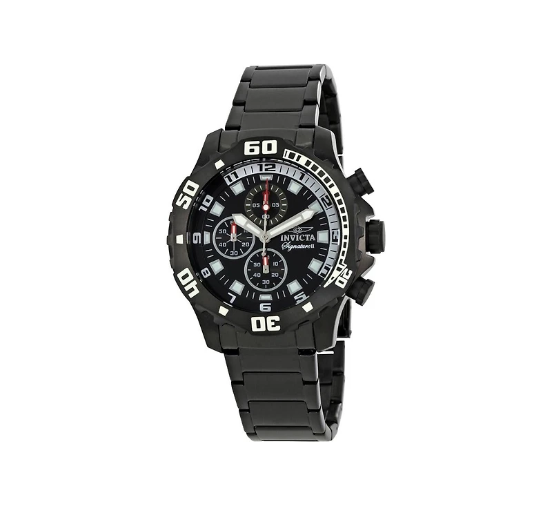 Black ion-plated stainless steel case with a black ion-plated stainless steel bracelet. Black ion-plated bezel. Black dial with luminous hands and index / Arabic numeral hour markers. Minute markers around the outer rim. Luminescent hands and markers. Chronograph - three sub-dials displaying: 60 seconds, 60 minutes and 1/20th of a second. Quartz movement. Scratch resistant flame fusion crystal. Push / pull crown. Solid case back. Case diameter: 45 mm. Fold over with safety release clasp. Water resistant at 50 meters / 165 feet. Invicta Signature Ii Chronograph Men's Watch 7335.