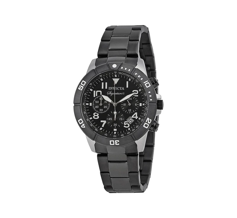 Stainless steel case with a black Pvd stainless steel bracelet. Black ion-plated bezel. Black dial with luminous hands and Arabic numeral hour markers. Minute markers. Tachymeter around the outer rim. Dial Type: Analog. Luminescent hands and markers. Date display between the 4 and 5 o'clock positions. Chronograph - three sub-dials displaying: 60 seconds, 60 minutes and 24 hours. Quartz movement. Scratch resistant mineral crystal. Push / pull crown. Solid case back. Case diameter: 43.5 mm. Band width: 22 mm. Diver clasp. Water resistant at 50 meters / 165 feet. Functions: chronograph, date, tachymeter, hour, minute, second. Casual watch style. Invicta Signature Ii Black Dial Black Pvd Steel Men's Watch 7351.