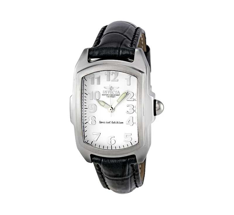 Silver-tone stainless steel case with a black leather strap. Fixed silver-tone stainless steel bezel. White dial with silver-tone hands and Arabic numeral hour markers. Minute markers around the outer rim. Dial Type: Analog. Luminescent hands. Quartz movement. Scratch resistant mineral crystal. Solid case back. Tonneau case shape, case size: 29 mm, case thickness: 10 mm. Tang clasp. Water resistant at 100 meters / 330 feet. Functions: hours, minutes, seconds. Dress watch style. Invicta Baby Lupah White Dial Quartz Ladies Watch 0247.