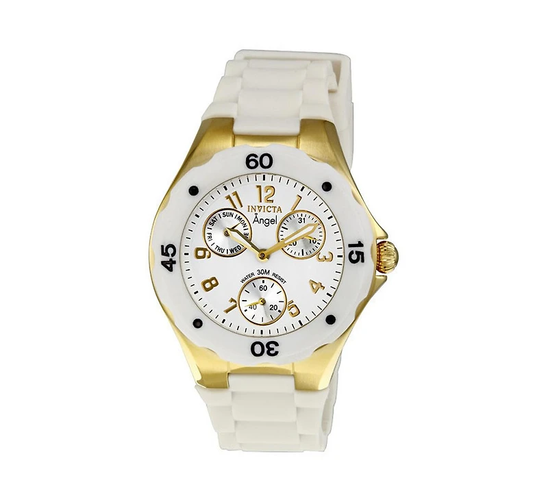 Gold-plated stainless steel case with a white rubber strap. Unidirectional white plastic bezel. White dial with luminous gold-tone hands and Arabic numeral hour markers. Minute markers around the outer rim. Three multi-function sub-dials displaying: day of the week, date, and small seconds. Quartz movement. Scratch resistant flame fusion crystal. Push / pull crown. Solid case back. Case diameter: 38 mm. Case thickness: 12 mm. Tang clasp. Water resistant at 30 meters/ 100 feet. Functions: hours, minutes, seconds, calendar. Invicta Angel Multi-Function White Dial Ladies Watch 0718